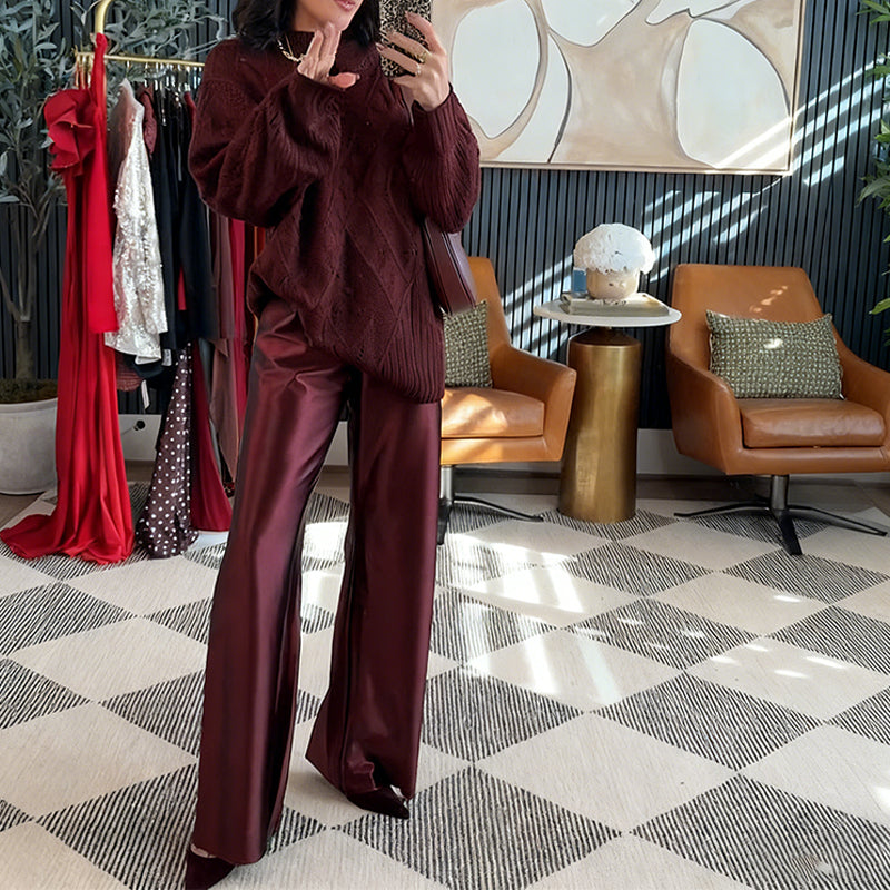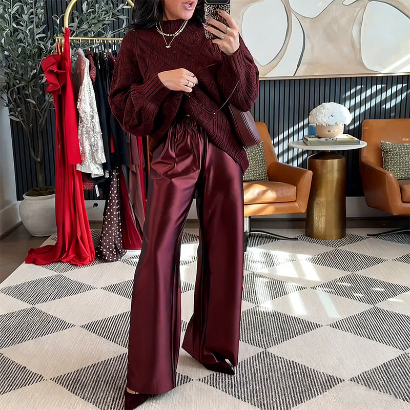 VIDE BENBUKSER â  Laget av et glatt, skinnende stoff, tilbyr disse buksene en vakker glans og et mykt fall. Det vide snittet skaper en langstrakt, grasiĂžs silhuett som beveger seg elegant med deg.